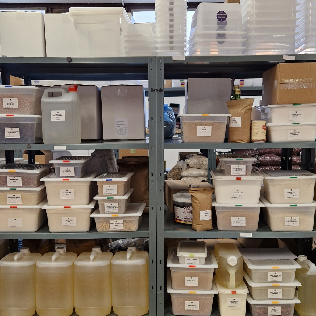 Nous proposons en majorité des produits alimentaires "secs" en vrac : farines, féculents, graines, fruits secs, épices, chocolats,...
